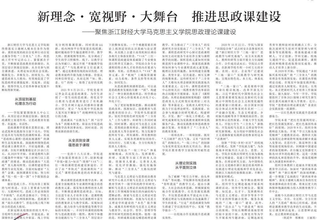 12月1日,《中国教育报》第六版以《新理念·宽视野·大舞台推进思政课建设为》为题,从理念引领、课程改革、教学育人、实践教学等四方面详细报道了我校思政课建设和教学改革的特色亮点。